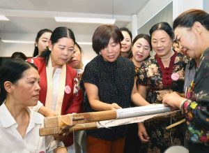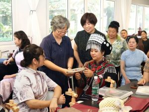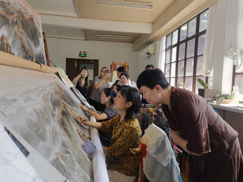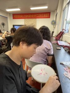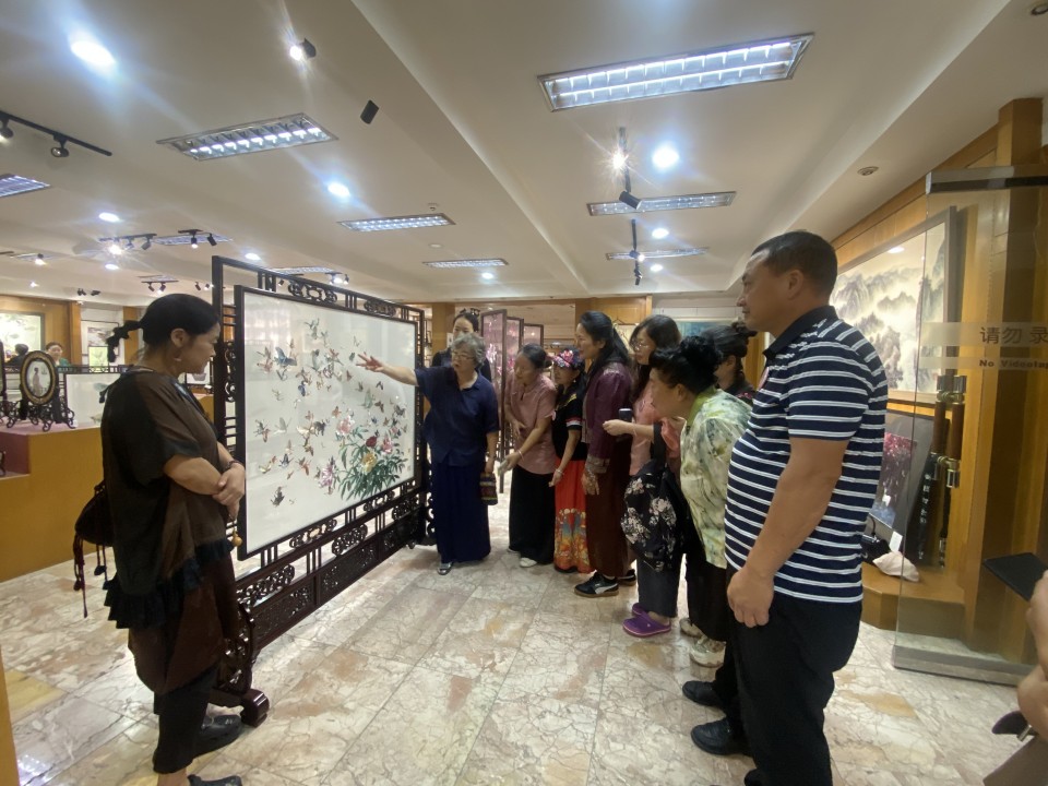 乡村工匠——苏绣团扇技艺训练营还安排了一次与千年苏绣文化的深度对话——苏州刺绣研究所的研学活动,欣赏传统花鸟山水和现代艺术创新的精妙绝伦的苏绣作品,与苏绣名家交流,体验“以针作画”、感受“平、齐、细、密、和、光、顺、匀”的八大苏绣技艺精髓和非遗文化的魅力与传承价值。