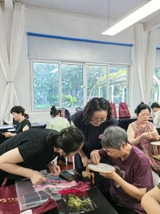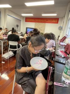 乡村工匠——苏绣团扇技艺训练营的课程兼具专业性、实践性与创新性,郑叶青老师为大家传授了团扇的核心技艺,通过梳理汉代纨扇——宋代书画扇——清代刺绣扇的历史脉络,结合刺绣、书画、雕刻等多重技艺和梅兰竹菊、山水诗词等扇面题材,解读“轻解罗裳,独上兰舟”为意的兰草与孤舟,破解“小荷蜻蜓”的荷叶透光感,传递了可执握的东方美学和以物载道的东方哲学。导师贴身指导学员团扇制作,在扇面的方寸之间点染乾坤、墨韵生辉;在技艺上融会贯通剪纸、蜡染、扎染、刺绣(如苗绣、壮锦、瑶绣)、缂丝、抽纱、烫花、通草堆花等,博采众长,以巧思妙手为团扇锦上添花,以及循骨而剪、圆润流畅,包边锁韵、圆满收鞘等团扇剪裁包边要点,夯实学员技艺功底,引导学员尊重传统技艺,大胆创新苏绣团扇技艺发展。